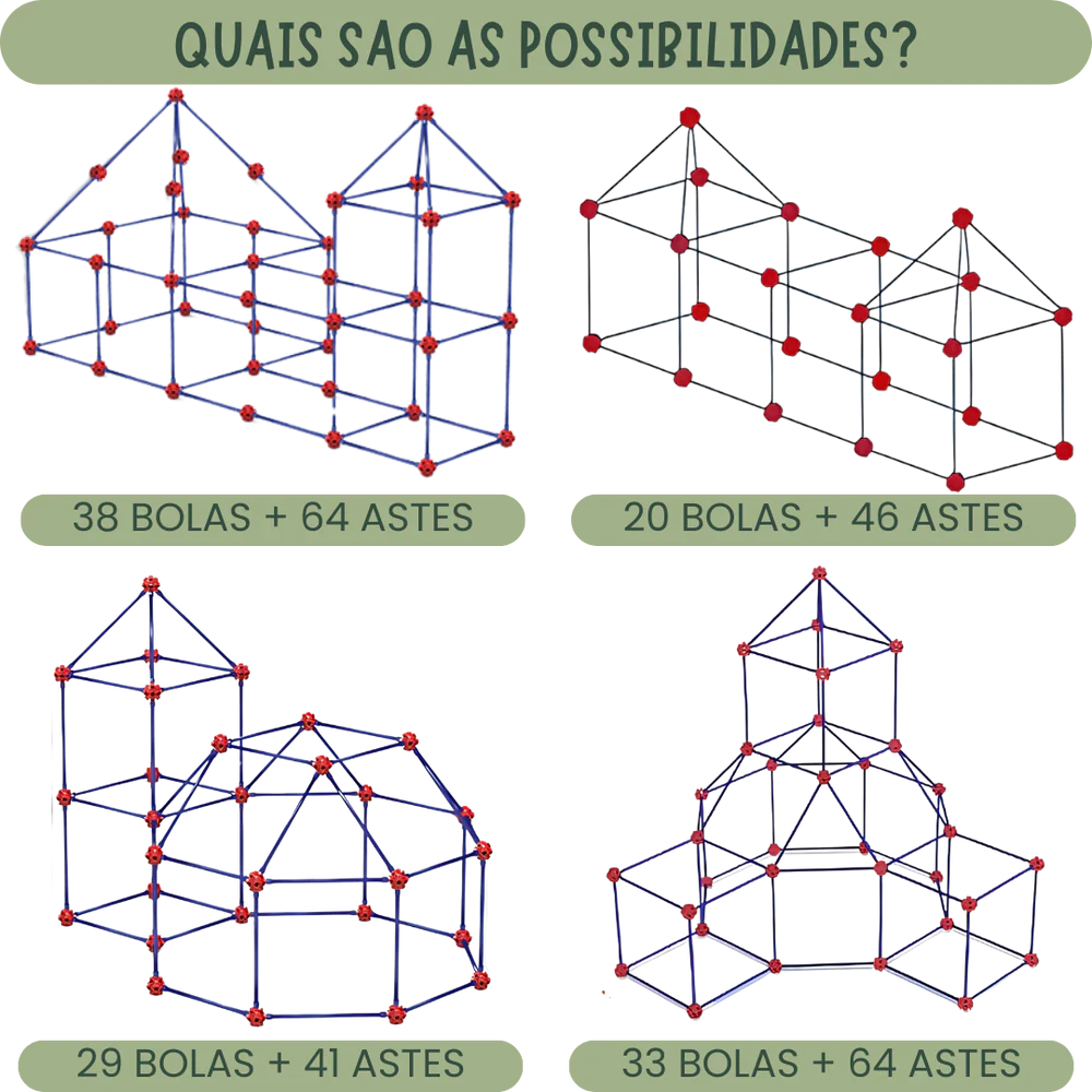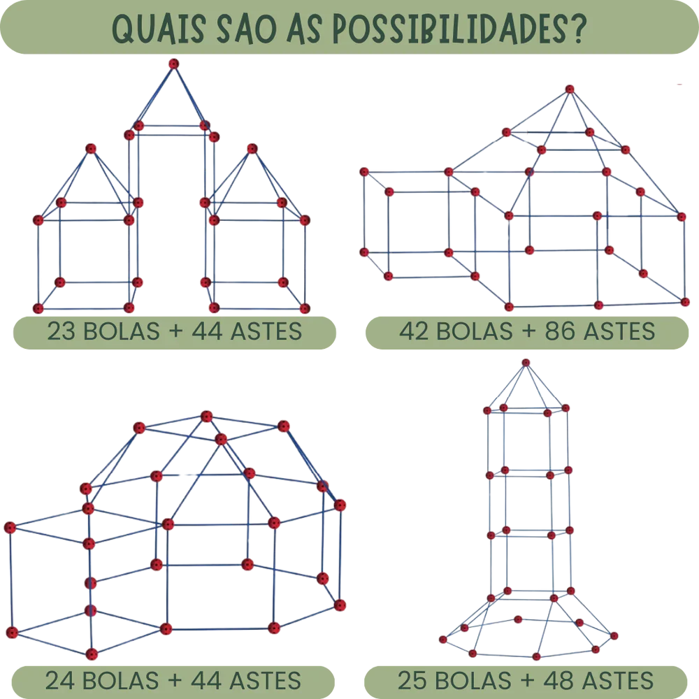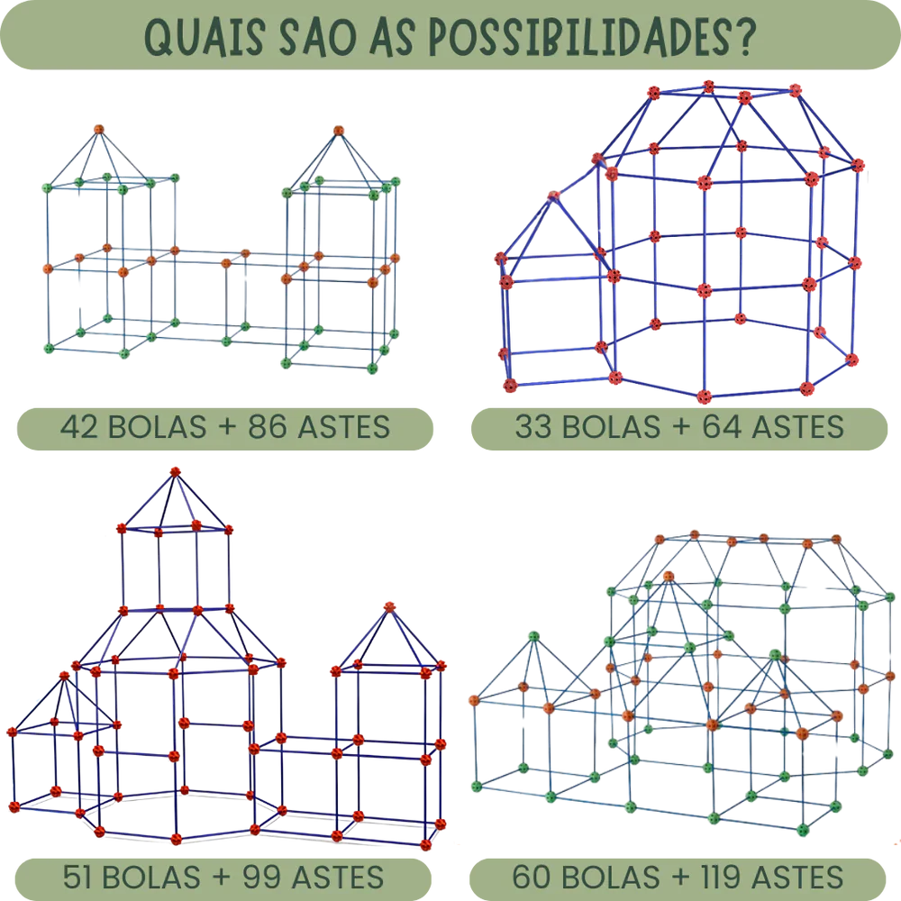 Cada fortaleza construída não é apenas uma estrutura — é uma oportunidade de aprender resolução de problemas, melhorar a coordenação motora e explorar novas ideias. O SuperFort™ oferece uma experiência educativa única, tornando cada momento de brincadeira mais divertido e enriquecedor para seu filho.